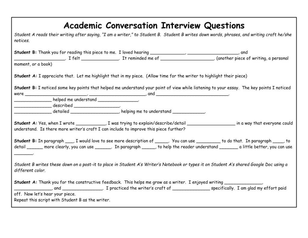 Sentence Stems and Interview Activities: Specific structured prompts to help students engage in meaningful conversations about their writing. Examples include:
