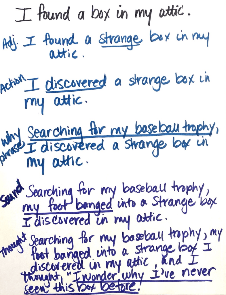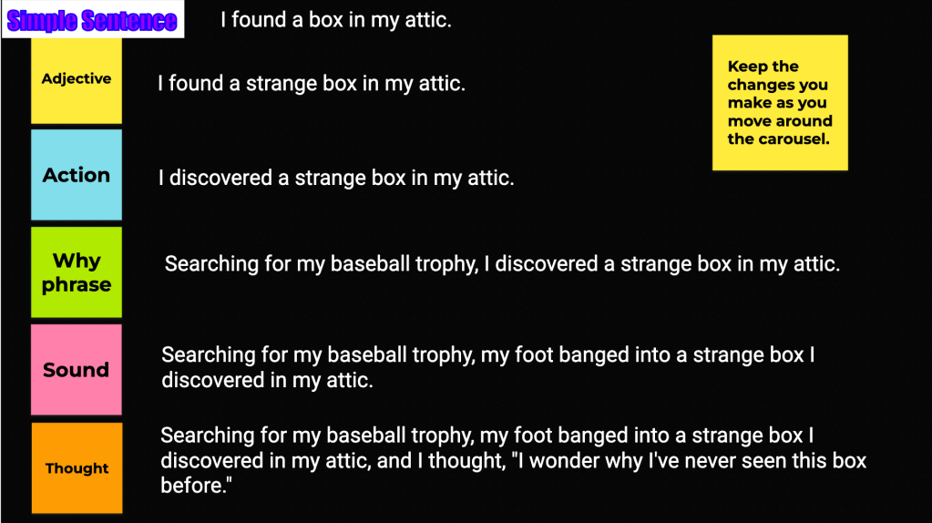 I start with the question to the students: How can we improve our sentences in our essays? Let’s practice with sentences that are plain but not ours. (Typically my students are excited because it takes the pressure off their writing for the moment)