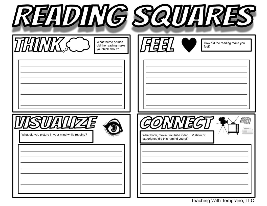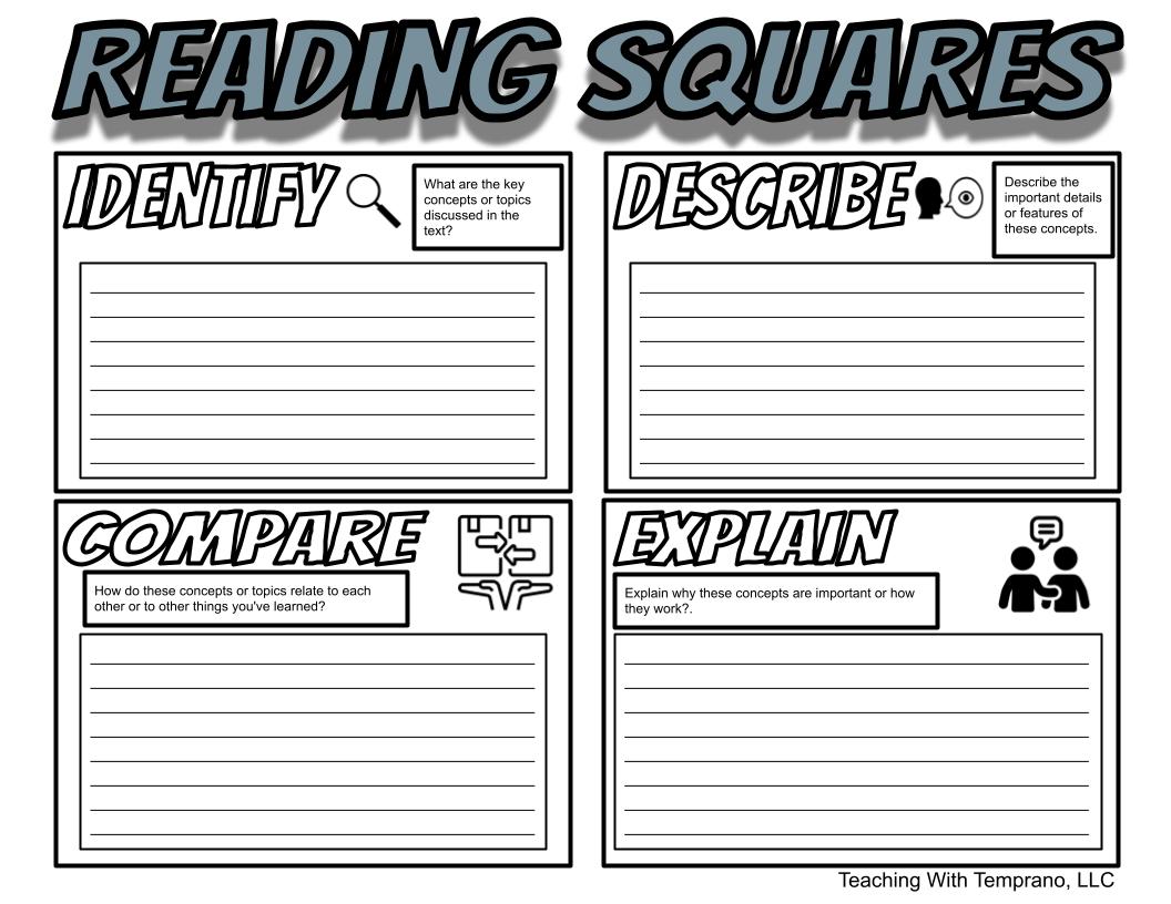 Adaptable for Complex Texts: Reading Squares is highly flexible, allowing students to engage with more advanced readings. Whether they’re analyzing complex themes, discussing multiple perspectives, or unpacking the subtleties of character motivations, this strategy encourages the type of critical thinking that advanced texts require.
